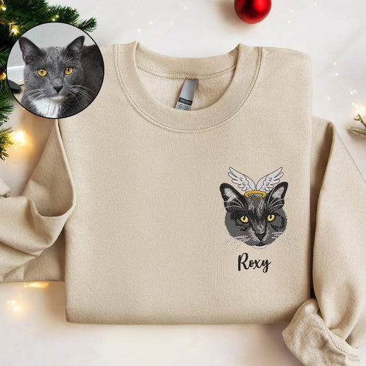 Embroidered Cat Photo Portrait Sweatshirt Custom Cat Names on Sleeve Gift for Cat Owner Pet Lovers