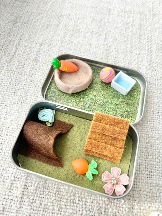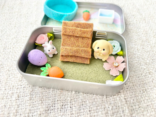 Miniature Bunny Pocket Pet Playset In A Tin Case Travel Toy for Kids Easter Basket Stuffer