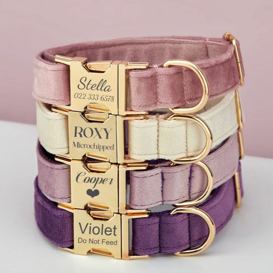 Multiple Color Velvet Personalized Dog Collar Leash Set with Bow Engraved Pet Name Metal Buckle Wedding Puppy Gift