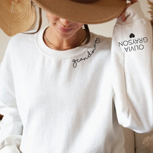 Custom Mom Neckline Embroidered Sweatshirt with Kids Name on Sleeve Mother's Day Gift for Mom Nana