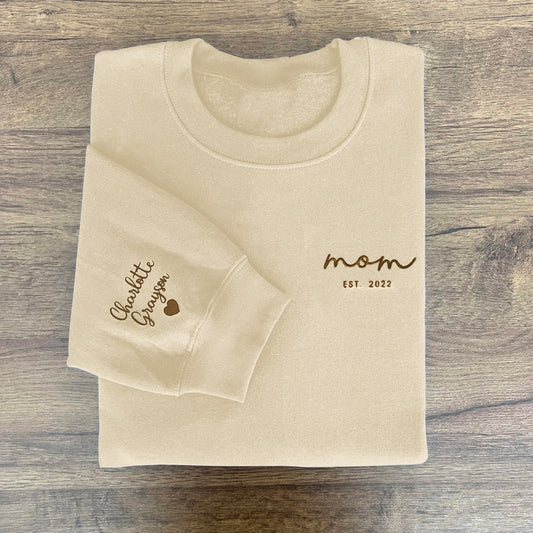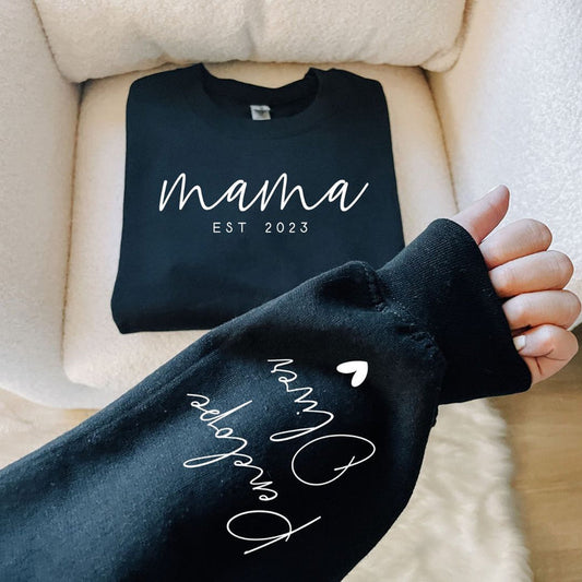 Personalized Mama EST Sweatshirt with Kids Names on Sleeve Mother's Day Gift