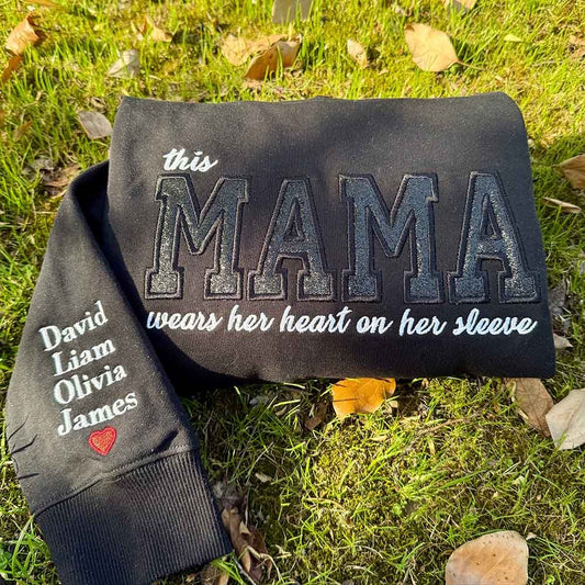 Mama Wears Her Heart on Her Sleeves Custom Embroidered Glitter Vinly Mom Sweatshirt With Kids Names For Mother's Day Gift