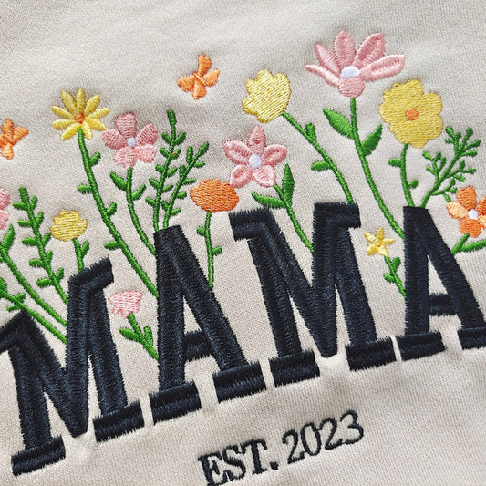 Embroidered MAMA EST Floral Sweatshirt with Kids Names Gift for New Mom Mother's Day Gift