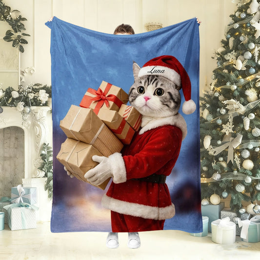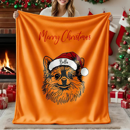 Personalized Christmas Pet Portrait Blanket with Santa Hat and Name Christmas Gift For Dog Cat Pet Lovers