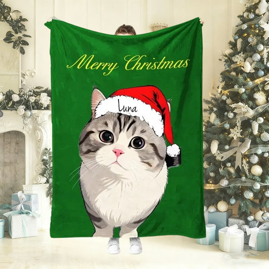 Personalized Cat Photo Portrait Blanket with Name – Custom Christmas Gift for Cat Lovers