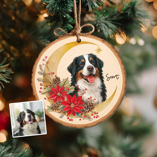 Personalized Watercolor Pet Photo Portrait with Moon Wreath Wooden Christmas Ornament Christmas Gift for Dog Cat Lovers