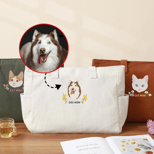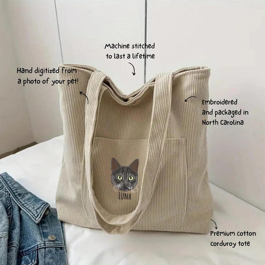 Individuelle Tragetasche mit Haustiergesicht – Besticktes Cord-Geschenk für Hundemama-Tierliebhaber