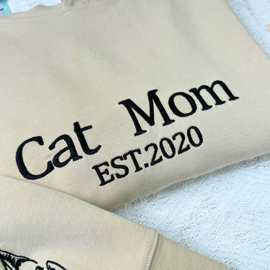 Besticktes Sweatshirt „Cat Mom“ mit Datum und Haustierohren am Ärmel, Geschenk für Katzenliebhaber