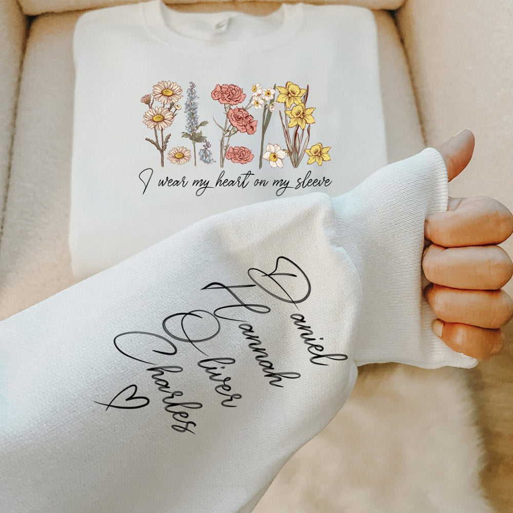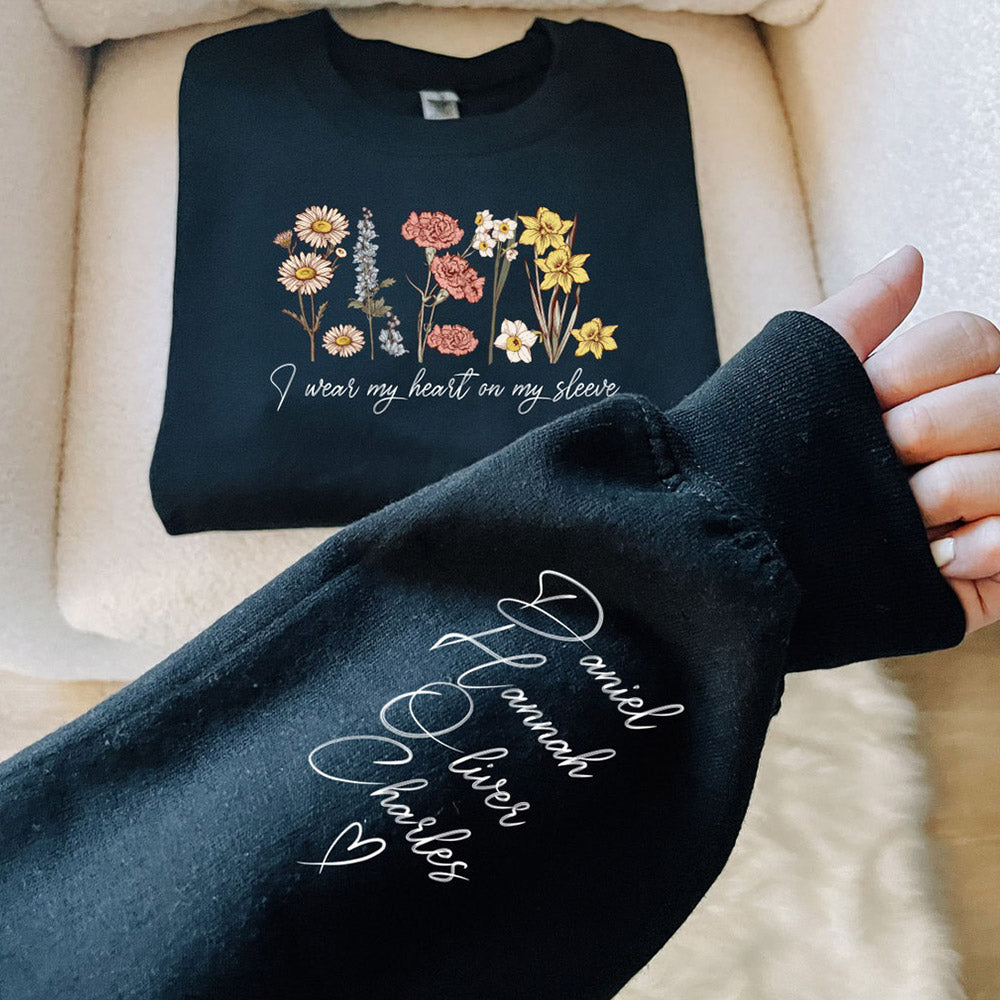 Dieses wunderschöne Sweatshirt mit der personalisierten Blumenaufschrift „I Wear My Heart On My Sleeve“ für den Geburtsmonat ist das perfekte Geschenk für jede Mama, Oma oder Tante, damit sie mit ihren Babys angeben kann!