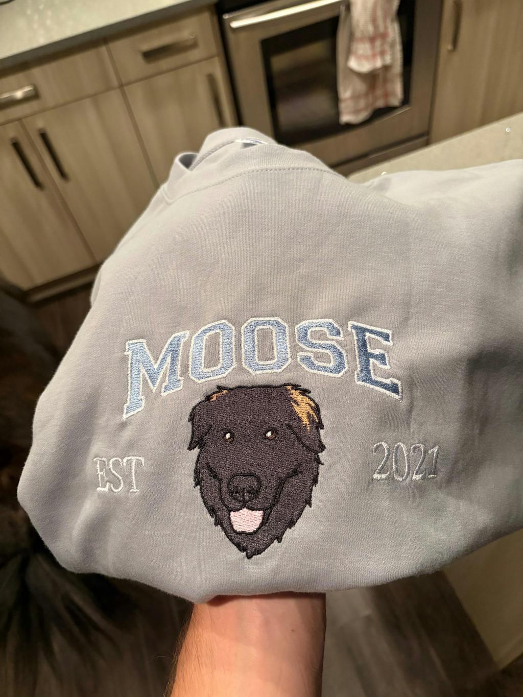 Sie können mir ein Foto Ihres Lieblingshaustiers schicken, und ich erstelle ein Design basierend auf Ihrem Foto und sticke Ihr Haustier auf ein Sweatshirt Ihrer Wahl.