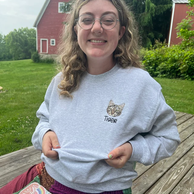 you can send me a photo of your favourite pet and I will create a design based on your photo and embroider your pet on a sweatshirt of your choice.