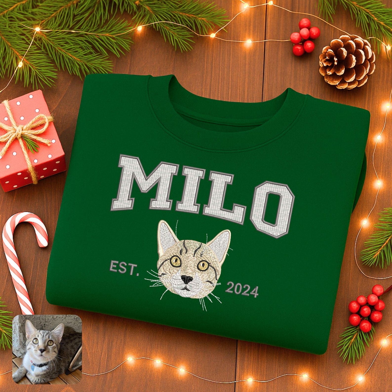 Custom Embrodied Pet Portrait Christmas Sweatshirt with Santa Hat Christmas Keepsake Gift For Dog Cat Pet Lovers